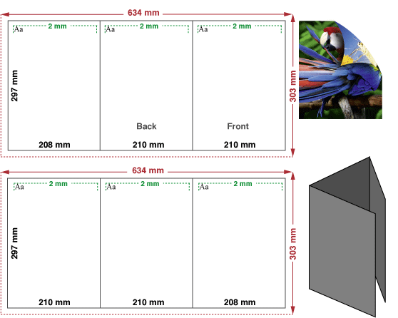 - Bei einem hochkantigen Wickelfalz musst Du bereits beim Erstellen auf die richtige Drehung achten. Wird Dein Wickelfalz-Faltblatt nach oben aufgeklappt, so musst Du die Innenseite auf den Kopf stellen.