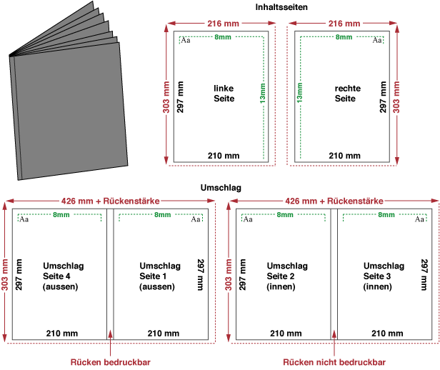 Innenteil Einzelseiten: 216 x 303 mm (Hochformat) oder 303 x 216 mm (Querformat)